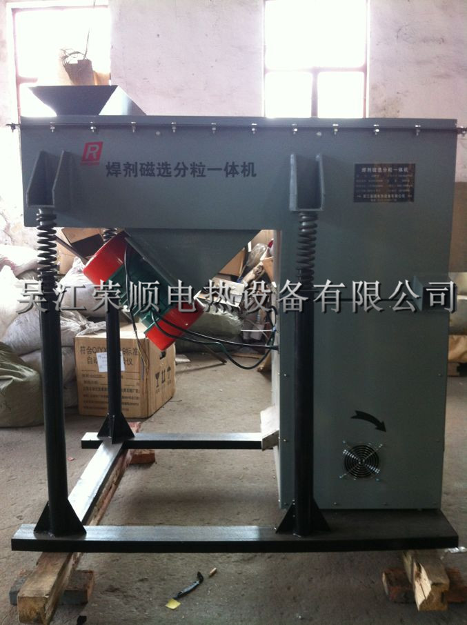 本機經我公司多次改良,研制出既有能有效清除焊劑中的鐵屑等含鐵雜質,又能分粒出其他顆粒、焊渣、細末粉塵的焊劑分粒磁選一體機,篩選量每小時800kg。磁鋼選用進口材料,分粒振動電機選用高性能優質電機。本機亦可篩選其它物品。
